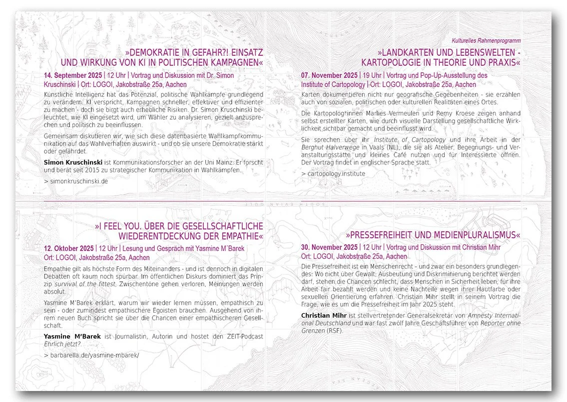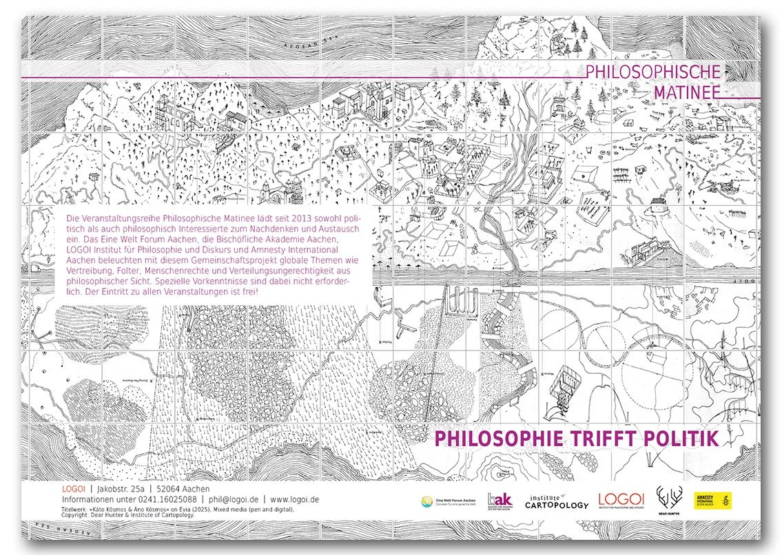 Die Veranstaltungsreihe Philosophische Matinee lädt seit 2013 sowohl politisch als auch philosophisch Interessierte zum Nachdenken und Austausch ein. Das Eine Welt Forum Aachen, die Bischöfliche Akademie Aachen, LOGOI Institut für Philosophie und Diskurs und Amnesty International Aachen beleuchten mit diesem Gemeinschaftsprojekt globale Themen wie Vertreibung, Folter, Menschenrechte und Verteilungsungerechtigkeit aus philosophischer Sicht. Spezielle Vorkenntnisse sind dabei nicht erforderlich. Der Eintritt zu allen Veranstaltungen ist frei, eine Anmeldung ist nicht erforderlich!